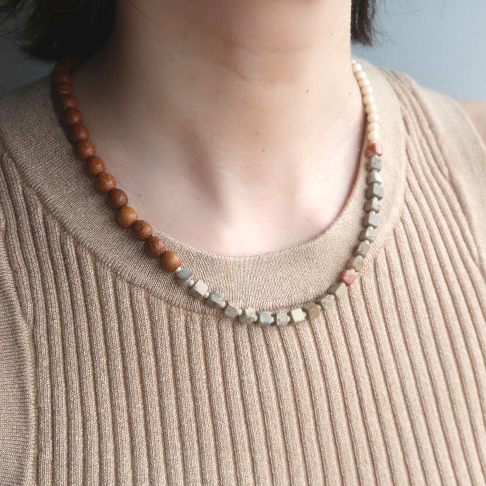 落ち着いたブラウンのカカオウッドを組み合わせたネックレスです。