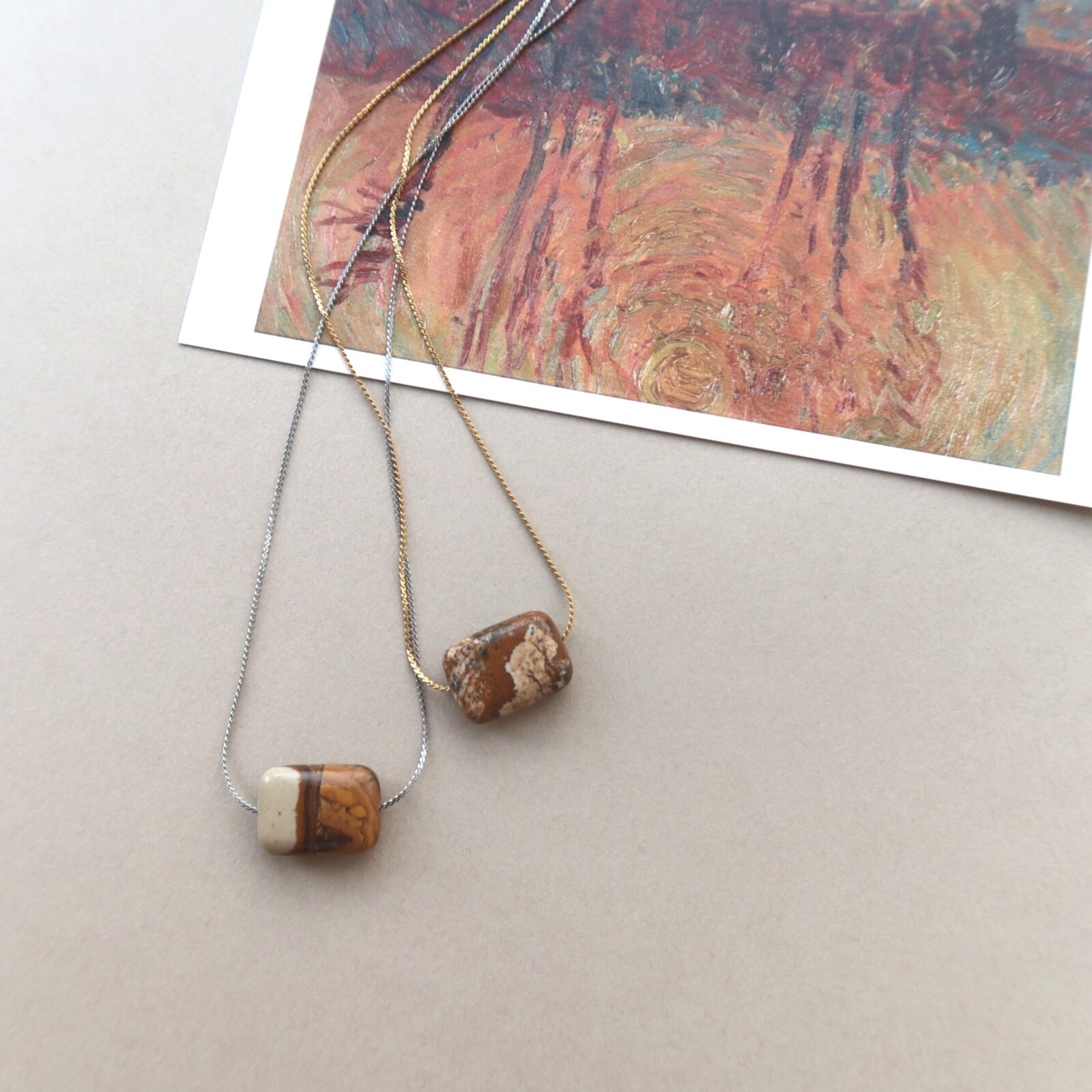 落ち着いた色味と自然の芸術ともいえる個性的な模様が魅力の天然石ピクチャージャスパーを中央にあしらったネックレスです。