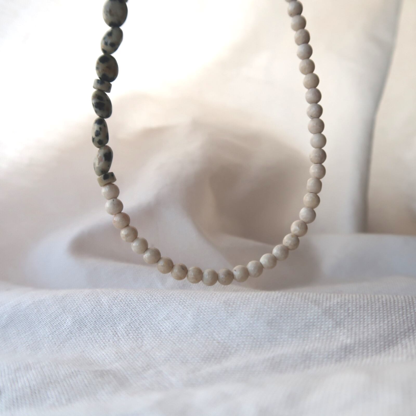 クリーム色の天然石リバースト―ンと天然石ダルメシアンジャスパーのコントラストが特徴的なネックレスです。