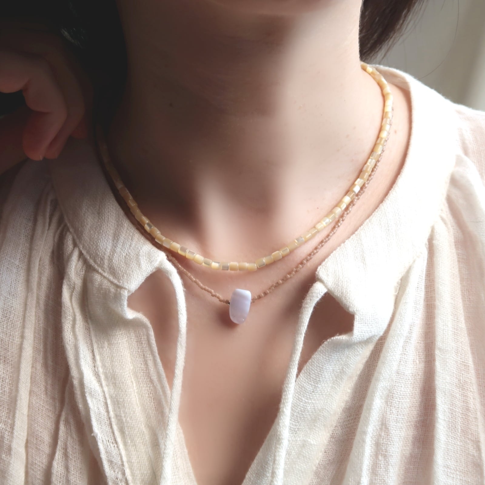 天然石〔ブルーレースアゲート〕を中央にあしらったビーズネックレスです。