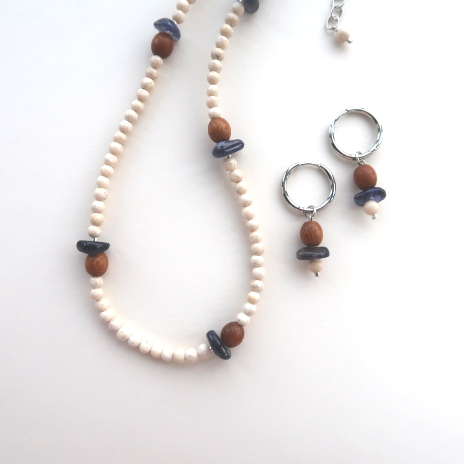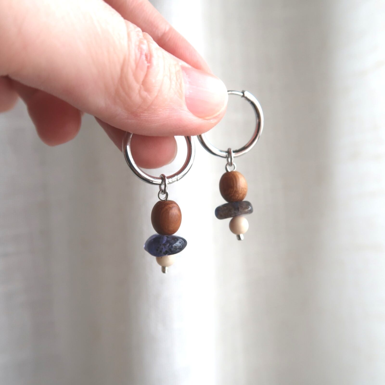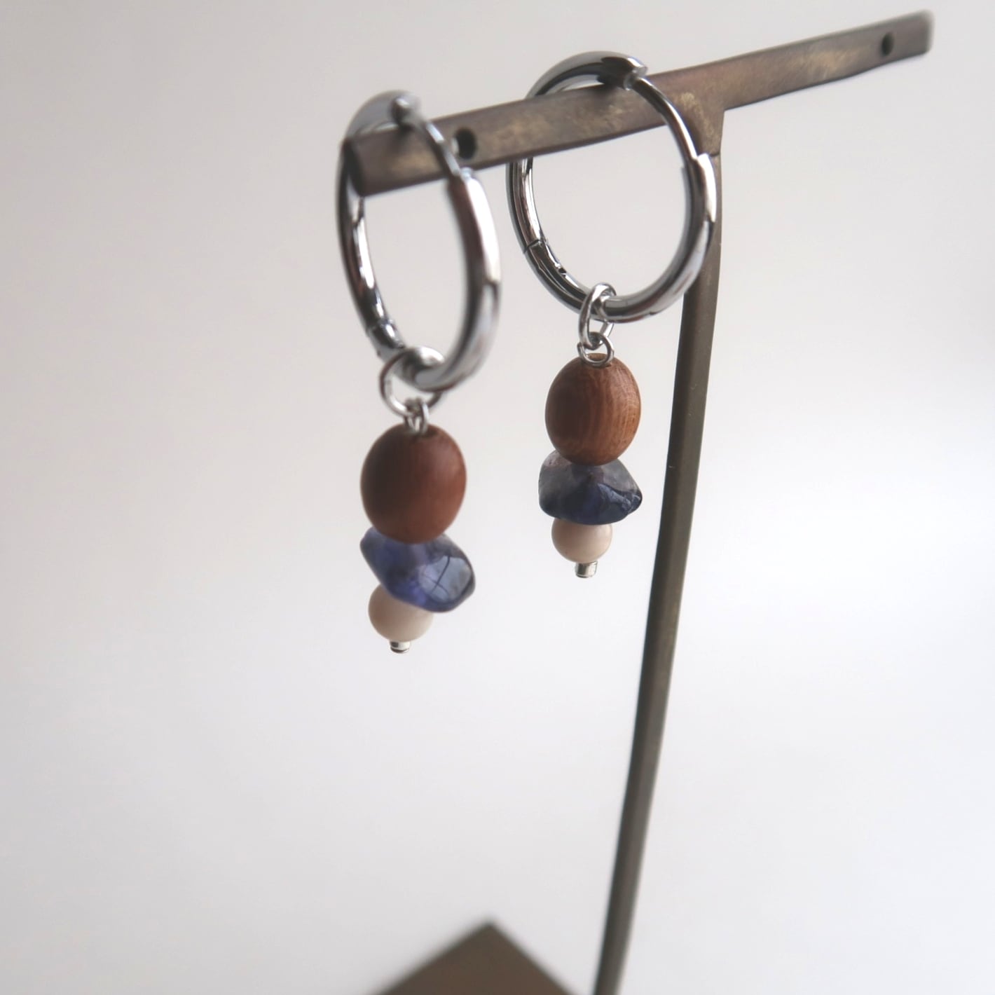 深い青が印象的な天然石アイオライト、ウッドの温かみ、天然石リバーストーンのラフな質感を重ねたフープピアス(イヤリング)です。